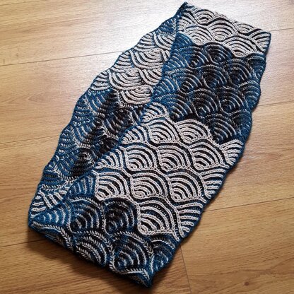 The WiFi Signal cowl is knitted in the round in two-colour brioche. The stitch pattern was first inspired by traditional japanese Seigaiha pattern (青海波), but when I looked at the finished piece it really reminded me of the symbol for WiFi Signals. This cowl is long enough to fit twice around your neck.