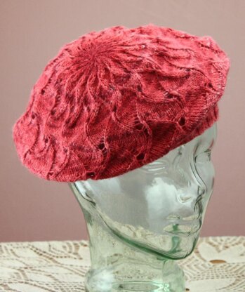 On trend but unique, this beret is fun and flattering. Using a variation of the scroll stitch knit in the round,the fabric appears to gently undulate like the petals of a flower, through strategic yarnover increases and decreases.
