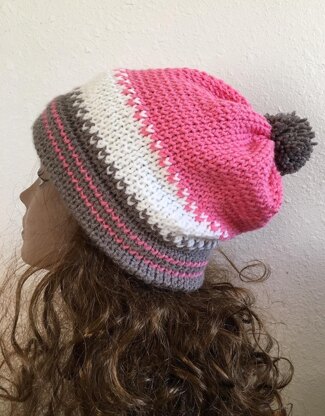 This hat uses a total of 200 yards of a worsted weight (4) yarn: 100 yards for the top color (pink in sample), 50 yards for the brim color (gray in sample), and 50 yards for the center color (white in sample).