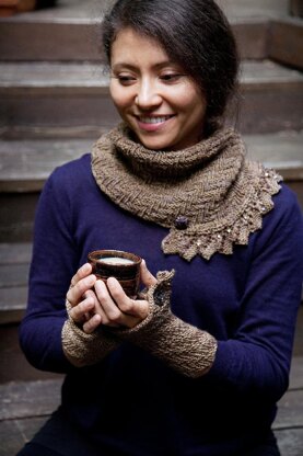 Gracefully buttoned, this gentle Moebius cowl, edged in beads and lace, is light and amazingly easy to wear. The position of the button accentuates the spiral in the cowl and in the matching cuffs, offers a resting place for the thumb.