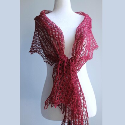 **The Wild Red Rose, new and improved design of it’s sister pattern Slow Motion shawl, is made in a classic rectangular shape but narrower and longer to wear it as a scarf. Also, this pattern incorporates more advanced knitting techniques such as a provisional cast on, picots and a picot bind-off. The reversible openwork stitch pattern used in this design is made by combining the rib stitch and eyelet stitch patterns in one; and an overall wave pattern is done by alternating the right leaning and left leaning columns of the rib/eyelet stitch patterns. The resulting fabric looks its best after wet blocking with pins, which is essential in making an airy and light open fabric. **