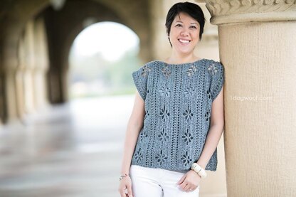 In the Wildflowers Tunic, poppy stitches and eyelets are repeated to create a sweet lacy-but-not-too-lacy top. The top is simply 2 panels, so if you can crochet in rows, you can make this! And by customizing the pattern repeats, you can customize the shirt for any size or length you'd like.