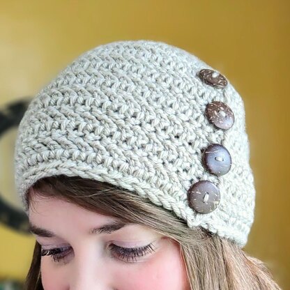 The Willow Button Hat is a unique fitted style hat with buttons that slip through the existing stitches to create an adjustable fit. It is designed to be a standard adult women's size. This hat is worked from the top down and starts with a magic circle. It uses the herringbone double crochet stitch and includes written step by step instructions for this stitch. You will need three or four button approximately 3/4" or 22mm and a needle.