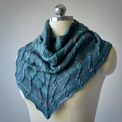 With a cable pattern that is simple, yet full of graceful movement, this cozy shawl is knit from the bottom up. Decreases worked on both sides make the knitting go faster until only one stitch remains!