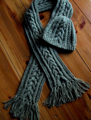 Cozy cables with SKYP stitches provide luxurious texture to this hat and scarf combo. The hat is worked in the round from the brim up. The scarf has a cable pattern which changes direction at the back of the neck so that both ends of the scarf have downward Willow tree roots.