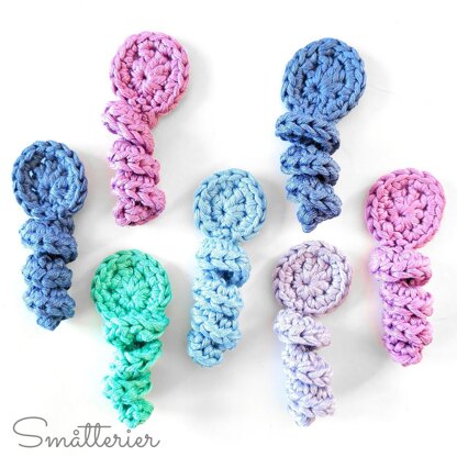 The worm is worked continuously in three rounds/rows, and uses the following stitches: sc, magic ring, hdc, dc, sl st, ch. The pattern is both written and charted.