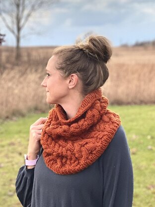 This cozy cowl is just full of cable twists. I have used a combination of both right and left-leaning cable crosses to create an engaging pattern with intriguing texture. When selecting your yarn, I find this cowl to work best with roving type yarn to really show off the depth of the cable stitches.