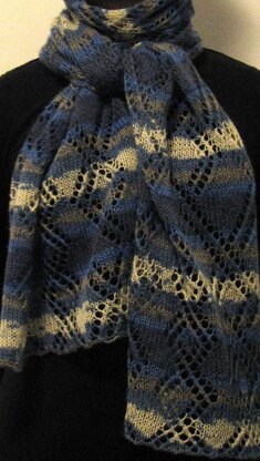 Named for the lines winding through the scarf's one end to the other, this scarf is knitted in two identical pieces which are then joined using kitchener stitch. The lace pattern is worked on the right side only and it is framed on both sides by three stitches of garter stitch.