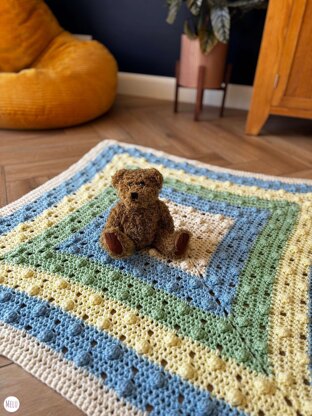This square-shaped blanket is created using a combination of bobble stitch, which forms soft, raised bumps, and filet crochet, which adds small decorative holes. Together, these techniques produce a lovely tactile fabric that's both simple and striking.