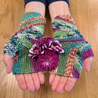 These fingerless gloves are designed in triangles around the thumb. The knitting direction changes often, so it is a brilliant way to display some self striping or hand-dyed sock yarn. The name "Windrädchen” is the german word for pinwheel.