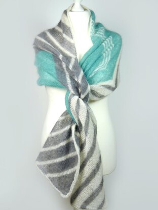 Gerade mal 111 Gramm wiegt die Stola WINDSEEKER, wenn sie aus Mohairgarn gestrickt wird. Das maritime Design passt wunderbar zur Urlaubsgarderobe, aber auch im Winter bringt sie als Schal Farbe in Ihr Outfit! Die Anleitung lässt sich leicht für andere Garne abwandeln. Ich rate zu dünnem Garn für gute Ergebnisse beim Spannen und einen schönen Fall.