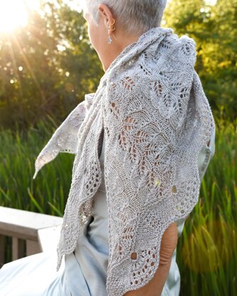 A triangle shawl in two sizes featuring multiple stitch patterns, including a scalloped hem. The triangle is knitted from the center back neck outward.