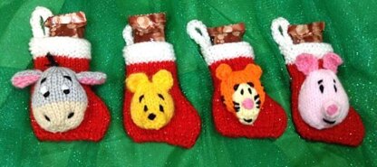 This knitting pattern is for a bear, tiger, donkey and piglet christmas stocking decorations