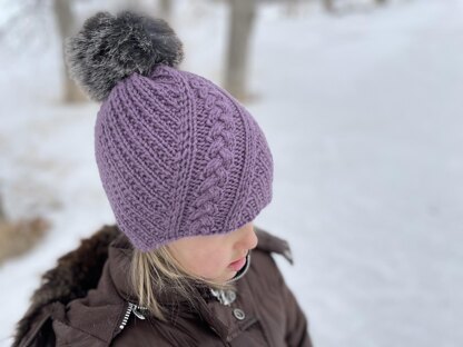 There are so many ways to knit a hat for winter. My 5 year old requested a purple hat with a pom pom for kindergarten. It has been a joy designing and knitting these hats for my girls. I have also been intrigued with the travelling cable. It has been fun to use this concept in my different designs. I love how this cable travels around the hat. This is the my first design with a traveling cable on a hat!