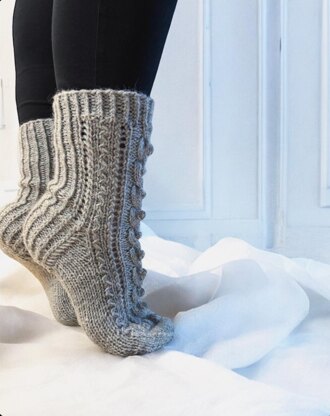 A pattern for beautiful socks featuring soft cables, lace, and bobbles. Includes clear instructions and charts.