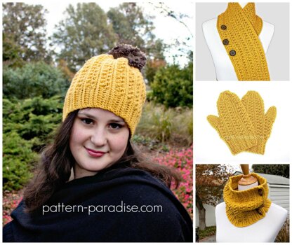 This pattern includes a coordinated set of 4 patterns including, hat, cowl, scarf and mittens. The set has a knit look, fits well and is very warm. Wear the pieces together or as separates. They make a wonderful gift too!
