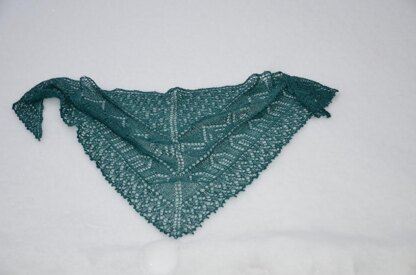 A triangular shawl is timeless piece, especially if it is full of lace. For those wanting a more modern look, wear it the other way around. I was given this yarn as a present last year, and its colour determined that it will be a winter piece. When I was looking at the yarn, I saw a vision of heavy snowfall, tiny cottages amongst huge pine trees – this is the vision that I knitted into the shawl. The quantity of the yarn I had determined that it needed to use no more than a skein of sock yarn. And it worked!