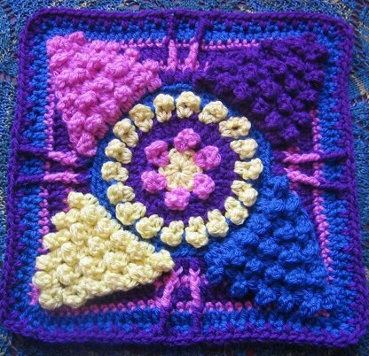 Beautiful textural block inspired by the Winter Sun, with a fun new technique I call 'V-buds' which are worked on the wrong side, and pushed through to the front, providing a textured interesting surface. The result, particularly for the 12" Dazzling, is a 3-D surface that is fun to do, and great to display as part of a finished afghan.