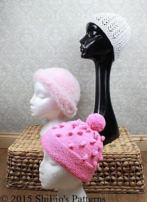 Sizes 1: To fit average size head Materials: Eyelash hat - 90g / 3oz (I used Stylecraft icicle eskimo) USA light worsted (3), UK double knitting, AU 8ply Bobble hat - 75g / 2.75oz Lacy hat - 45g / 1.5oz Knitting needle UK 3.75mm, USA 5