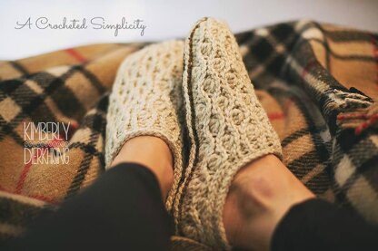 Lion Brand Vanna's Choice was used for the slippers in the photographs. Less than 1 ball of 2 colors is needed to complete a pair of slippers.