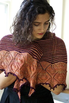 This two-color, top down, shawl is shaped with 4 equally sized wedges to create a half-pi shape. The body is worked in stripes, while the bottom border features a pretty lace pattern. A picot bind off gives the bottom edge a delicate finish.