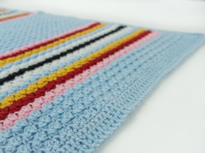 An advanced beginner crochet blanket with a cluster stitch consisting of double crochet, chain one and single crochet. Works up quick and has a nice soft squishy texture when complete! Featuring Caron Simply Soft with contrasts of soft blue and pink, red, gold and black make up a nontraditional winter color palette!