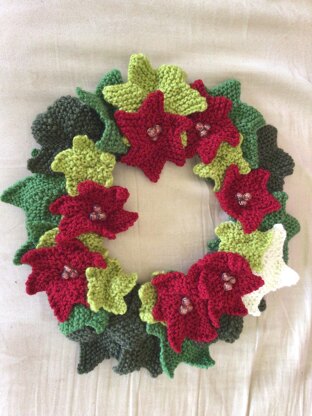 crocheted and knitted wreath to hang on your front door any size can be made need : metal ring, needles, crochet hook and yarn 1 skein in white, red and three different greens, or colours of your own choice