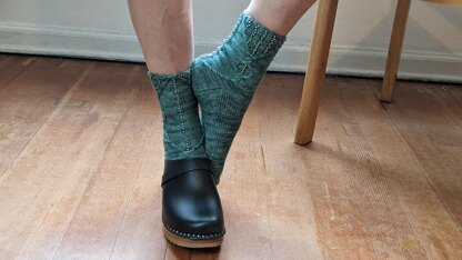 This top-down gusset and heel flap sock features cables, beaded fluted ribbing, a sexy heel, and beaded front and back seams reminiscent of stockings from days gone by.