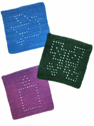 Quick and easy to knit for your winter decor, these lovely eyelet dishcloths feature a dove, holly and candle motifs. Knit with worsted weight cotton yarns, each dishcloth is approximately 27 centimeters (10-1/2" square). This is great beginner project as it includes both charts and full line-by-line instructions.