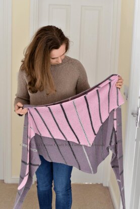 The triangle shawl is knitted sideways starting from corner to corner in garter stitch with simple lace eyelets in contrast shades. The big shawl is knitted with Milburn 4ply in shade Dusk and Silverdale 4ply Mini Skein set in Charcoal Fade. Mini shawl is knitted in Askham 4ply in shade Blossom and Silverdale 4ply Mini Skein set in Charcoal Fade.