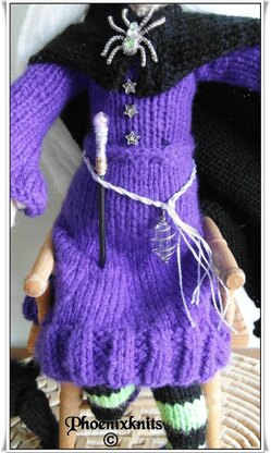 She has her ‘familiar’- Scaredy Cat – comes with her on high speed trips on the broom, however, he has a hard job staying on the back upright with speed freak Witchhazel at the helm. The instructions for making him are also included in the pattern.