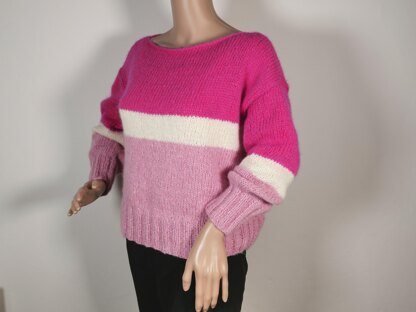 Sweater Pink is an easy knitting pattern for a women's sweater in 6 sizes (S to XXXL), which is knitted bottom up. The front piece and the identical back piece are knitted flat. The alternation of colors creates a beautiful stripe pattern. The used stitches are simple, namely knit and purl and knit 2 stitches together. You will need to sew the shoulder seams together, close the sleeves and sew them into the sweater and close the side seams.