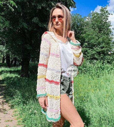 Knitting PDF pattern for create women’s summer sheer hooded cardigan without closure.
