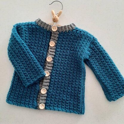 Finished Size: 0-3 mos (18” chest), 3-6 mos (19” chest), 6-12 mos (20” chest), 12-18 mos (21” chest) (Sample size 12-18 mos shown on a 6-12 mo old baby)