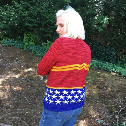 Wonder Woman cardigan is inspired by everyone’s favorite Amazon-princess-warrior. Knit in fingering weight, it’s perfect for year-round layering. This cardigan is meant to be open in the front. The sides do not meet in the front and there are no button holes in the front band.