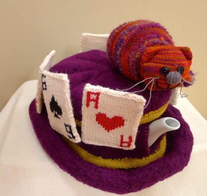 The inspiration for this tea cosy was Alice in Wonderland. I tackled the Mad Hatters hat by making a knitted and felted top hat. Once felted I just cut openings at each end for the spout and handle and blanket stitched the edges. Next I embellished the hat/cosy with a very cheeky Cheshire cat and some over sized playing cards. Don’t be alarmed by the look of the hat prior to felting it will be huge and look nothing like a hat. The felting process will work its magic.