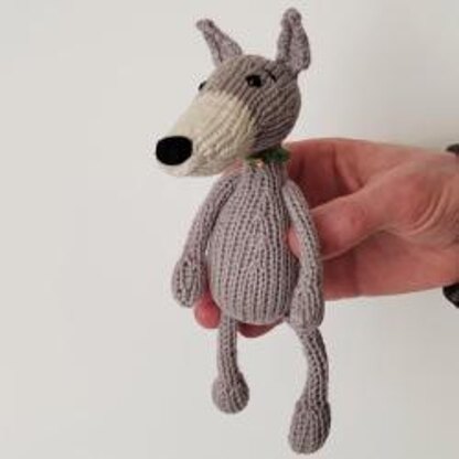 **Gilly** is a sweet greyhound, a lovely little knitting project for using up ends of yarn balls. Knitted mostly in stockinette, this pattern uses simple increases and decreases for shaping. Designed by Amanda Berry @fluffandfuzz, the greyhound is knitted in cotton DK yarns. Most pieces are knitted on single pointed needles (not in the round), the tail is an i-cord tube worked on two DPNs, and the collar a single crochet chain.