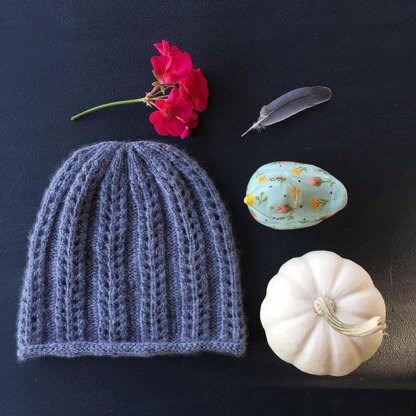 Woodland Path is a pretty, feminine hat that starts with a narrow, rolled brim and then goes into a simple-to-knit eyelet rib that tapers gracefully with carefully placed decreases in the crown. It can be fitted or slouchy, depending on your preference, and looks lovely in solid colors, but works well with tonal and slightly variegated yarns too. It’s perfect for showing off that one special skein you’ve been hoarding in your stash!