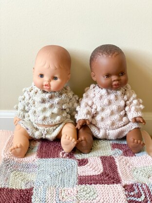Knit up this adorable set in no time! A simple set of bloomers and a popcorn pullover make the perfect outfit for any 13-inch doll, such as a Minikane doll. Let your child match with the Woodland Pullover for Babies and Toddlers as well! This is a great way to use some scrap yarn or extra yarn from another project for the cutest set that will bring a smile to any child's face. The set is easy and quick to knit!