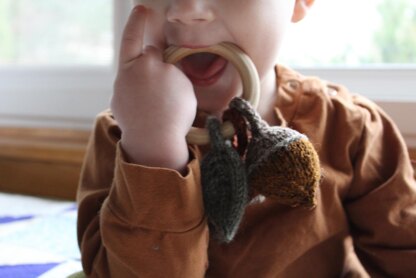 The Woodland Teether is a super fast and satisfying knit, perfect for stash busting! The design features three little “charms” on the ring, a mushroom, an acorn, and a leaf.