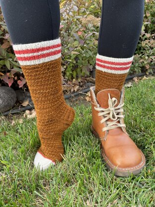 I wanted to make a fun hiking or boot sock that had a little interest. So, I added the sporty stripes to the cuff and a fun little texture for these warm and woolen socks.