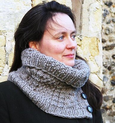 This cowl is worked flat and can be worn buttoned up in several ways. It’s perfect for the very coldest of days!