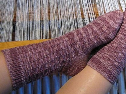 This sock pattern utilizes the woven ladder stitch which showcases floats on the right side of the knitted fabric. This technique minimizes the pooling common with handpainted or heavily variegated yarns while taking advantage of their lovely colour gradations. These socks are knit from the top down in a fingering weight yarn.