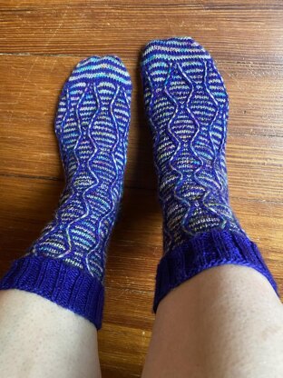 Sizes: 60 (75, 90) sts: Child/Adult XS (M, XL): to fit 7 (8.5, 10)" /17.75 (21.5, 25.5)cm foot circ with 1”/2.5cm negative ease.