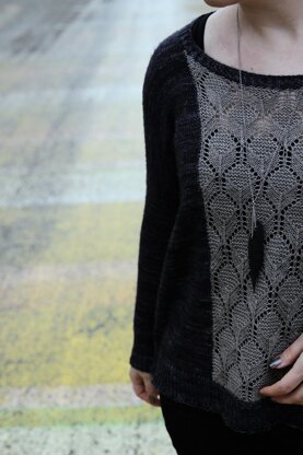 The sweater is worked top-down seamlessly. The contrast colored lace panel is worked as intarsia. Once the front and back are joined, the lace panel is worked as intarsia in the round. I know this may sound scary but I promise you, it isn’t. Intarsia in the round isn’t as difficult as it sounds at all. There’s a photo tutorial for it on the last page.