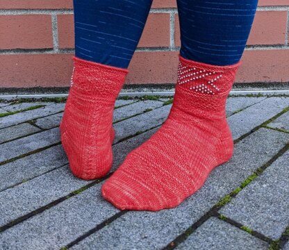 First up is Xiomara, which features a geometric beaded cuff and a deep, deep vee feature on the front of the leg. The back of the leg has a cabled seam, framed by ribbed gusset increases, and the design is loosely mirrored on the foot.
