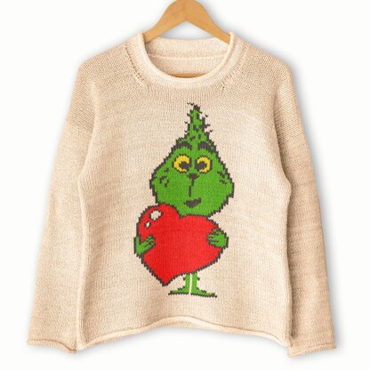 In the PDF file you will find complete instructions for knitting a women’s sweater featuring a Grinch Baby with heart motif. First, the back is worked flat in stockinette stitch, then the front is knitted with the motif added in intarsia. After shaping the neckline, the shoulder stitches are joined with the easy 3-needle bind-off method. The sleeves are then picked up directly from the armholes and knitted down. Everything is done step by step, making the process simple and easy to follow.