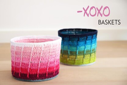 The XOXO baskets are designed to accompany the XOXO pillow. You can create one basket with the leftover yarns from the pillow. You can find all information on my website, Haak Maar Raak.