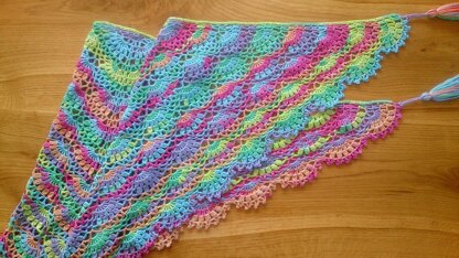 Measurements: 55 inches (140 cm) top length without tassels, 25 inches (64 cm) depth in center. This pattern is a repetition of few rows which means you can use any yarn or hook and customize your shawl size by the number of repetitions. Please remember, that the size of finished project depends on used yarn, hook and your style of crocheting.