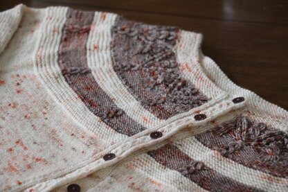 Yetta Cardi is a vintage-style cardigan with a touch of Japanese lace in the yoke. The bands feature eyelets that double as buttonholes. Yetta is a seamless, top-down knit for two colours of speckled or solid fingering/sock yarn. No stranding is required.